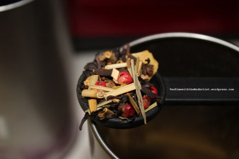 This particular tea is made of cinnamon, cloves, black & red pepper, coconut, and lemongrass along with white and green tea. It has a nice spicy smell when I open the tin. When steeped it still smells of cinnamon and cloves but it isn’t as strong. The color is a deep reddish-golden color as you can see from the picture. The taste is smooth and complex with a slight kick at the end from the spices. Often times I blend this with the Samurai Mate Chai from Teavana because the flavors meld together well. I think that this would be pretty good for a Chai latte as well. You would probably have to add more tea when steeping to strengthen the flavor though.