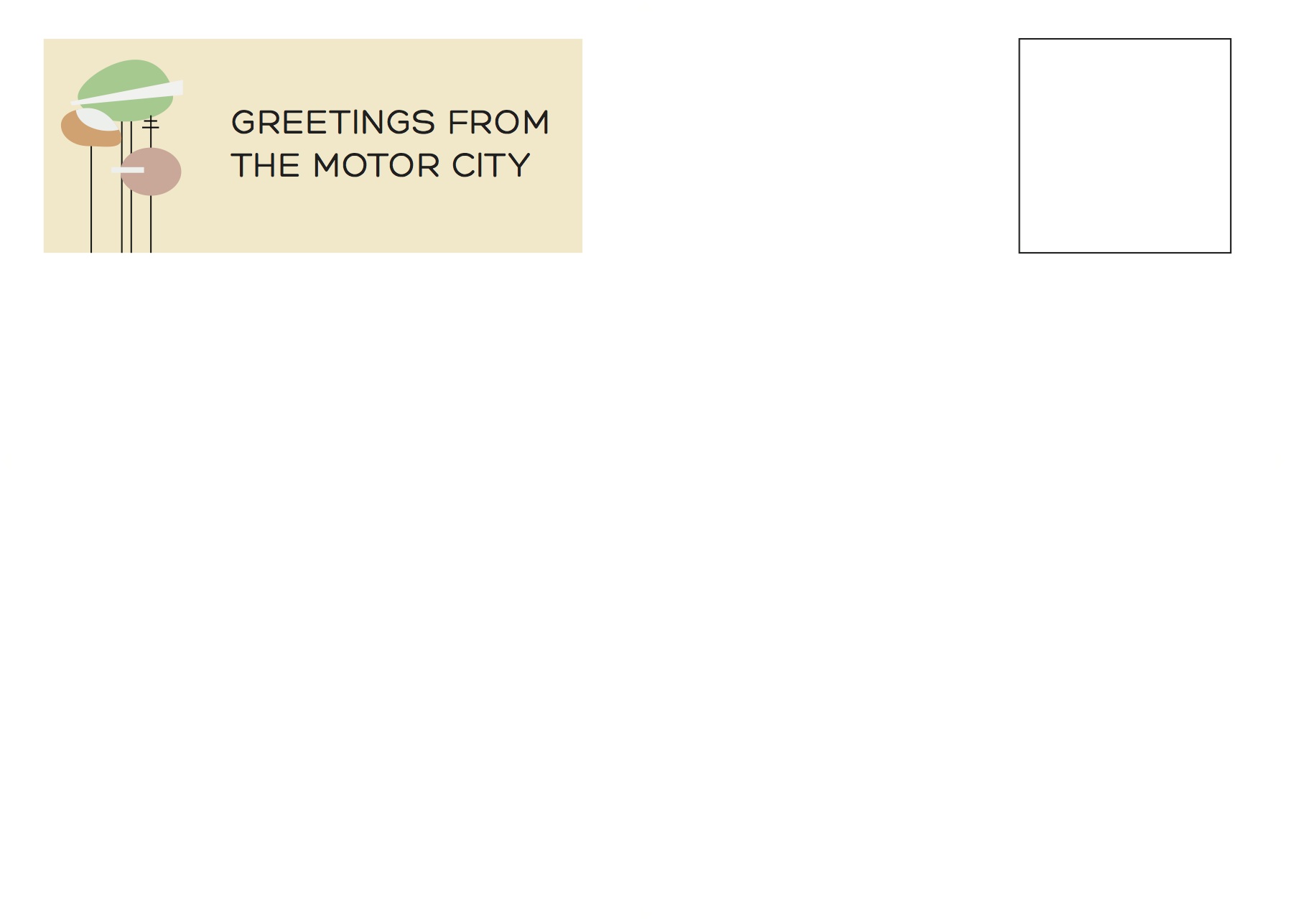 For the Detroit postcard, I settled on the Mustang because it’s such an iconic image for the city. This particular postcard was really inspired by the Jetsons. I enjoyed the Jetsons growing up so I was really digging this one. I wanted to play up the idea of hoover cars and I figured since Detroit is in such a desolate state right now, there probably wouldn’t be much on the ground to look at, so I left that out.
