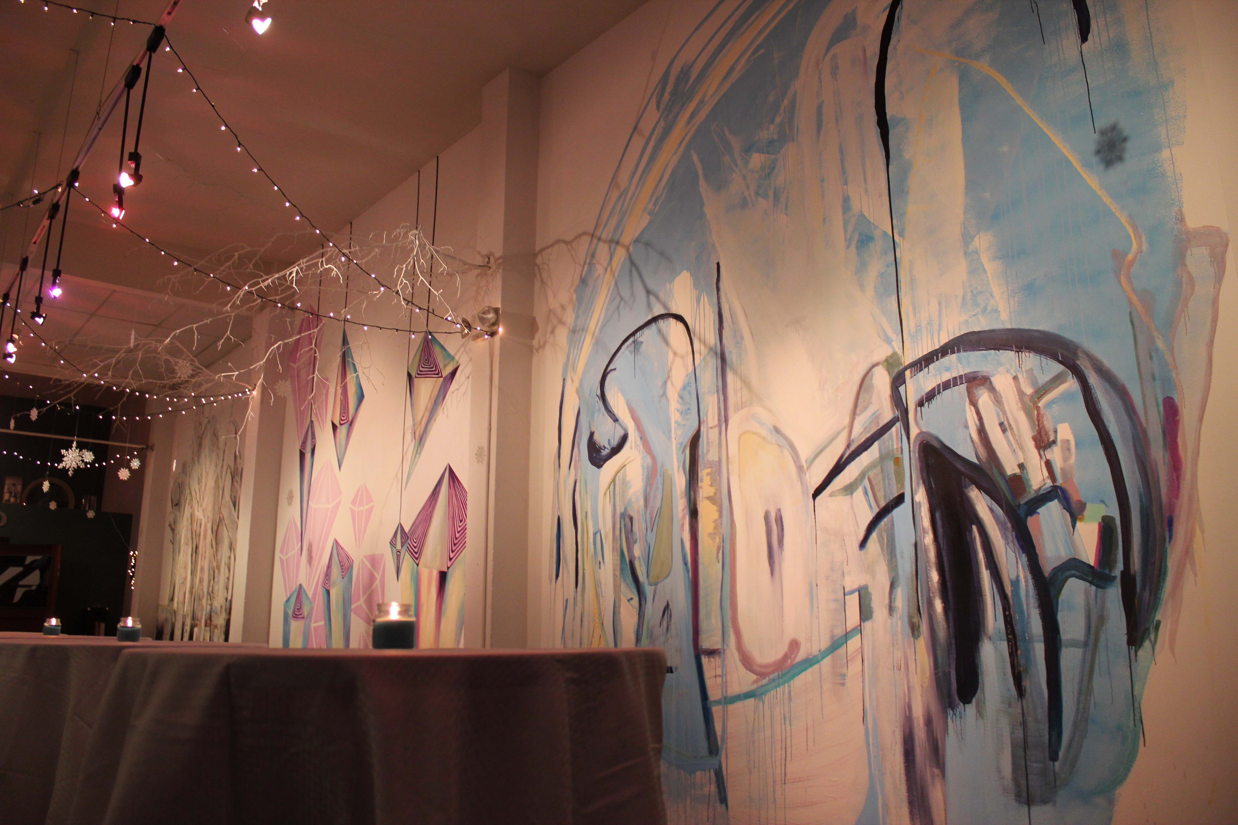 January 16th was the soft opening for the rebranded gallery space connected to the Uncorked Wine Bar in downtown Akron. The rebrand includes a new name, 22 High Street Gallery, and is curated by a friend of mine, McKenzie Beynon. Her first show was Winterland, a set of six murals painted by local artists, Maggie Duff, Laine Keener, Cody Knepper, Jeff Schleis, Dillon Sedar, Meagan Smith and Melissa Urian.