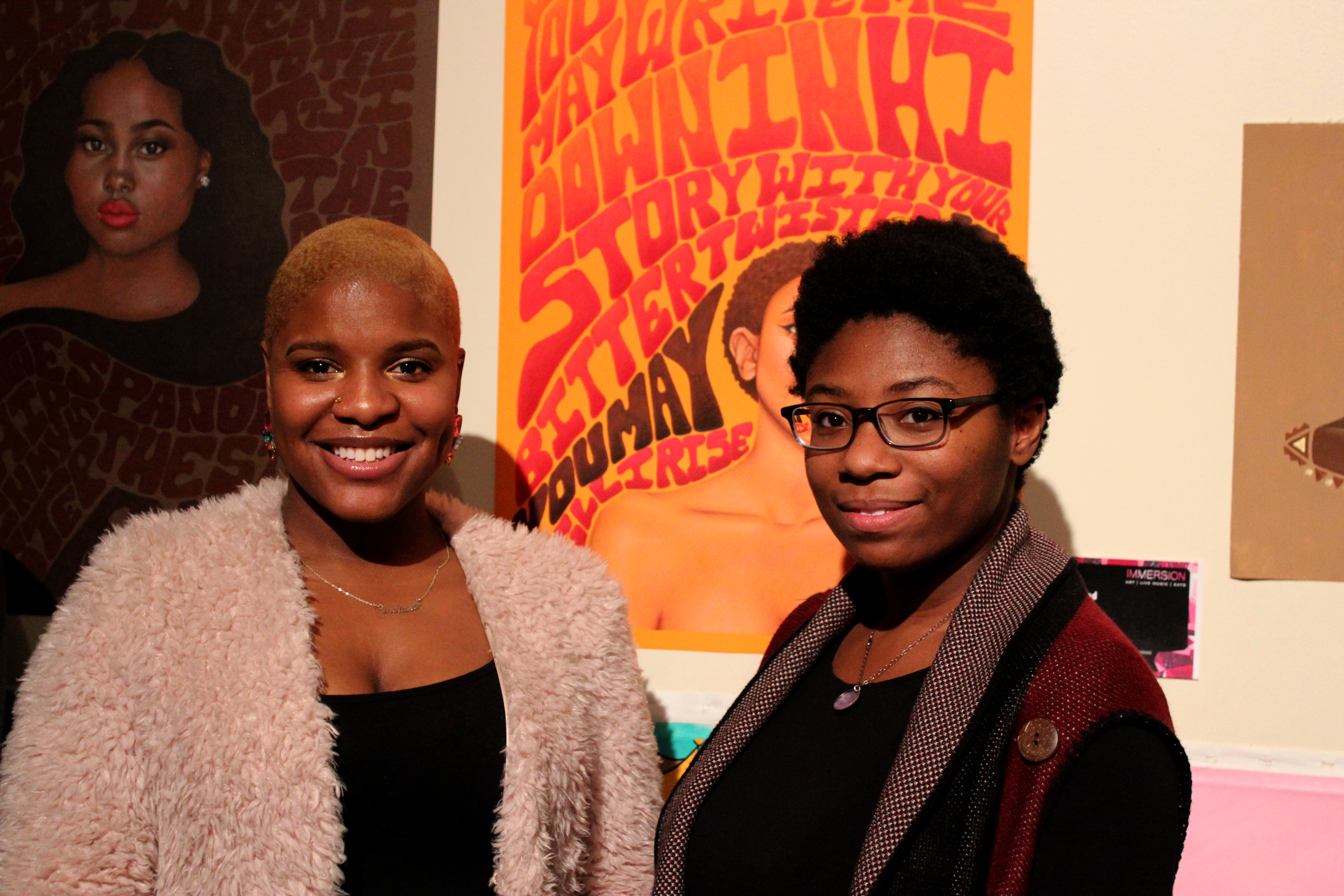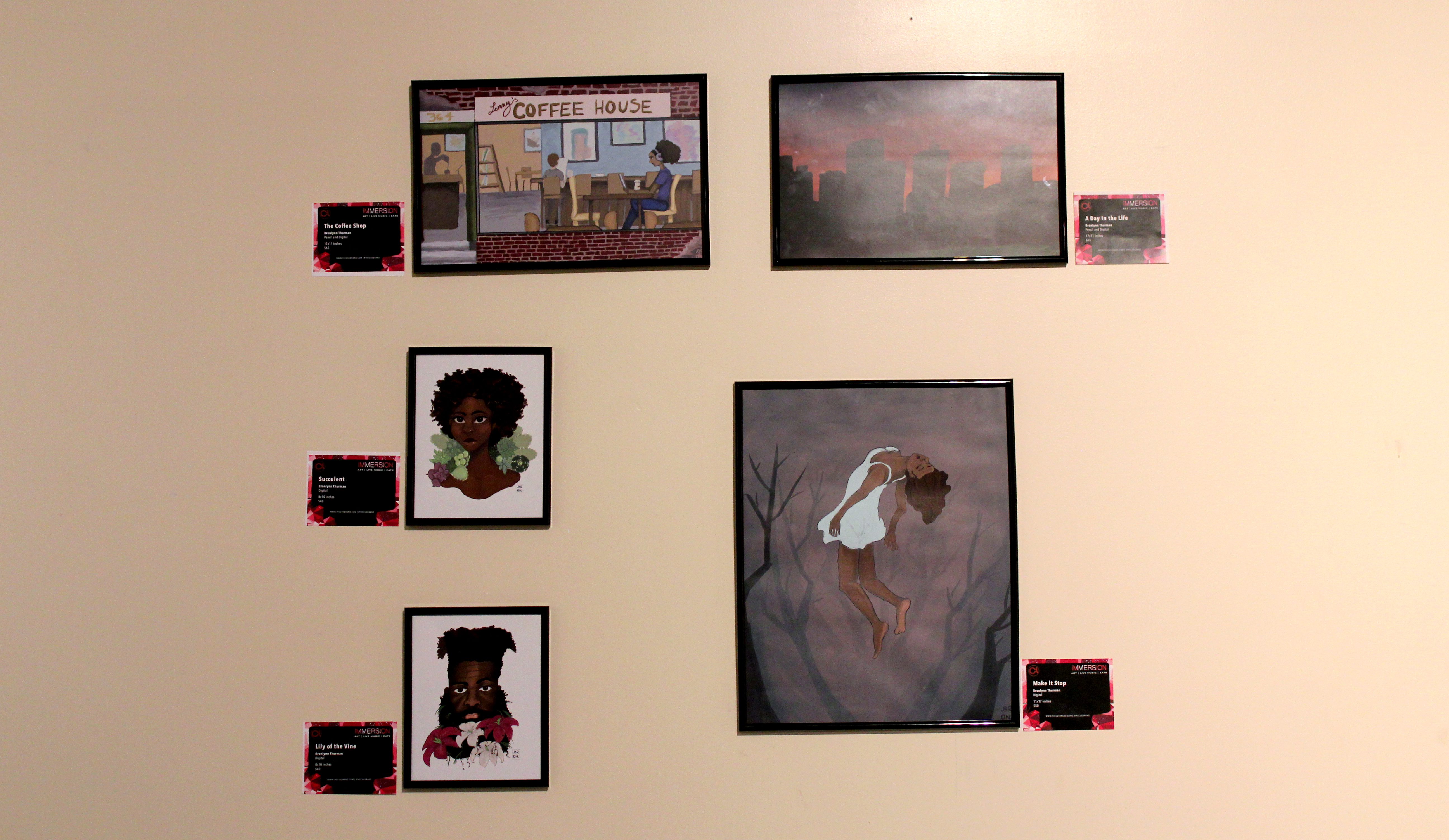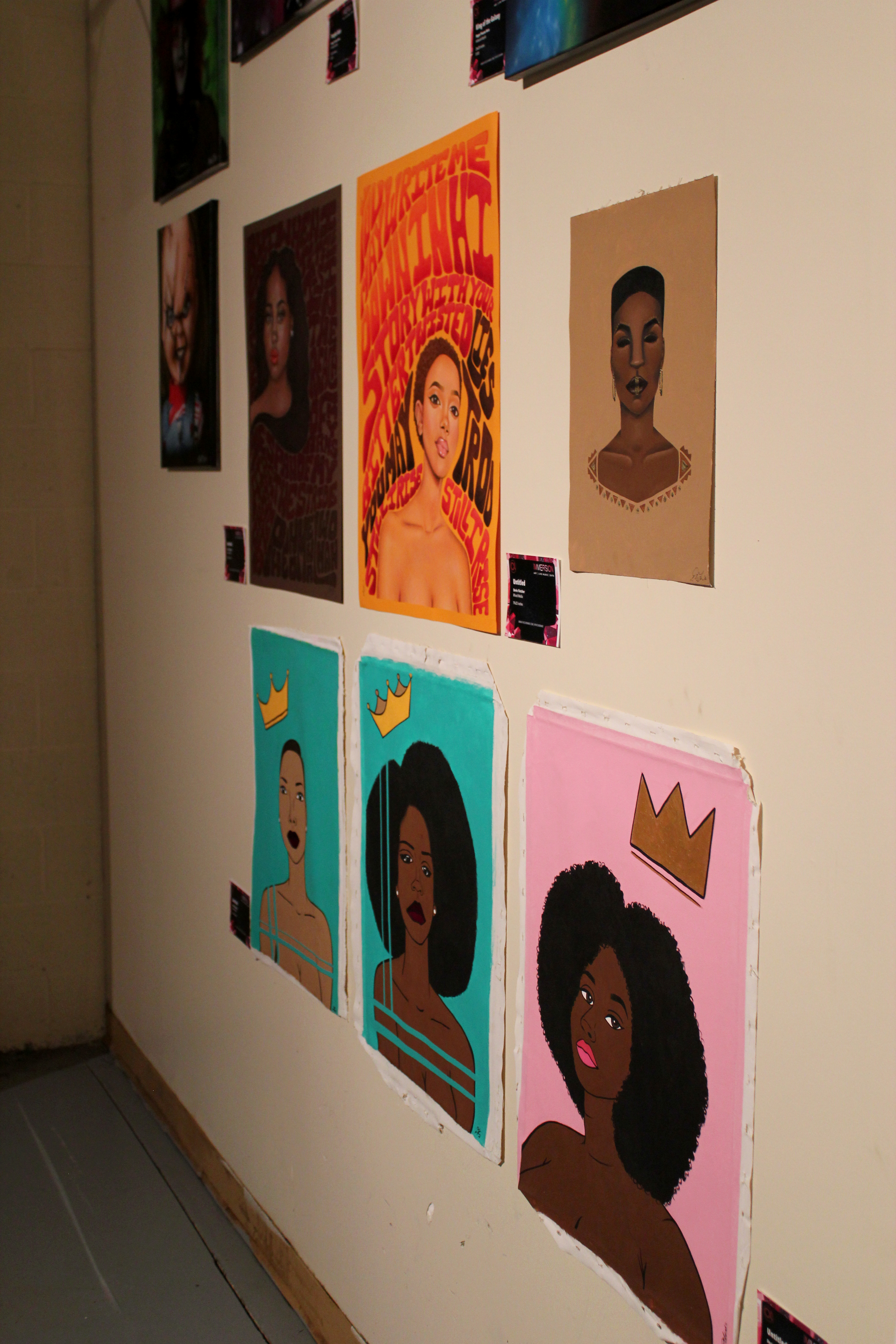 Anyway, Immersion was an art show, concert, party that brought together people from all walks of life. Several of the artists involved were from the University of Akron’s Myer’s School of Art, others were trained at art colleges like SCAD, and some were self-taught. The styles ranged from digital to airbursh to painting to experimental. My personal favorites were the colored pencil pieces (seen above) by Derin Fletcher. The level of detail blew me away and they drew your eye immediately due to the vibrant background colors.